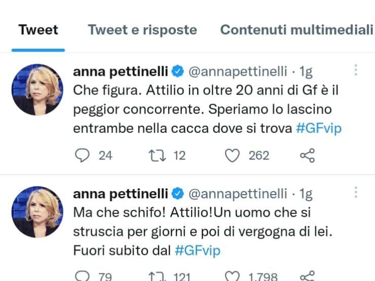 Anna Pettinelli sui social ha lasciato un commento al veleno contro Attilio, chiedendo in qualche modo la sua eliminazione: “Ma che schifo! Attilio! Un uomo che si struscia per giorni e poi si vergogna di lei. Fuori subito dal GF Vip”, ha scritto sul suo profilo twitter. Ma non è finita qui perchè l’ex professoressa di Amici ha anche scritto che secondo il su parere Attilio è il peggior concorrente: “Che figura! Attilio in oltre 20 anni di GF è il peggior concorrente”.