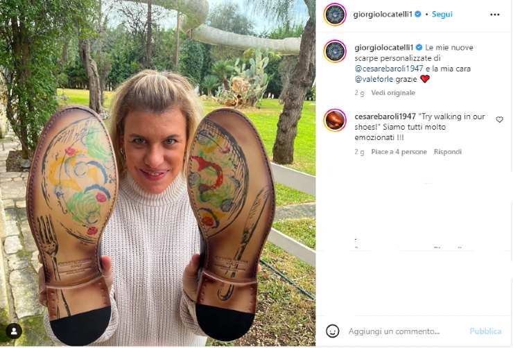 L’amica dello chef infatti appare nello scatto che accompagna i ringraziamenti, con in mano un paio di scarpe di Cesare Baroli, la celebre azienda di calzature, famosa per i bellissimi disegni che spiccano sulle suole.