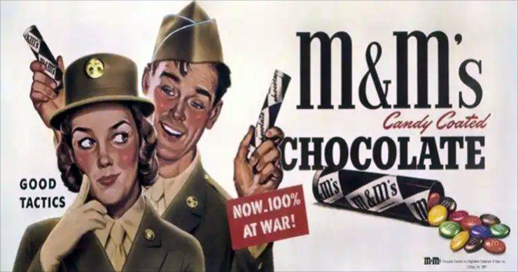 Inizialmente, Mars vendeva M&M solo all’esercito. Quando gli Stati Uniti entrarono nella seconda guerra mondiale, avevano bisogno di una caramella comoda e resistente al calore che viaggiasse bene, e gli M&M erano all’altezza. L’accordo esclusivo di Mars con l’esercito degli Stati Uniti ha avuto un altro vantaggio. Dopo la fine della guerra e il ritorno a casa dei soldati, conoscevano bene le caramelle e contribuirono a renderle uno spuntino popolare negli anni del dopoguerra.