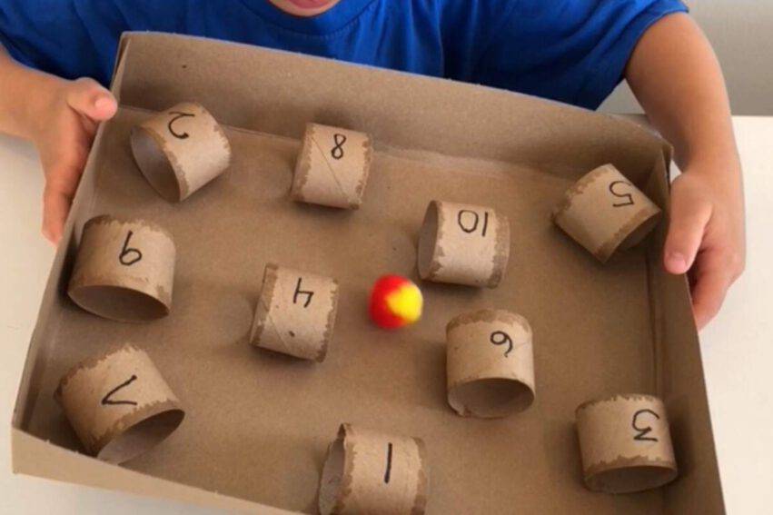 2. Contenitori da pallina rimbalzante. Posiziona i rotoli di carta igienica al centro del tavolo e inizia la battaglia. Chi sarà capace di centrare i fori con la pallina? Mi raccomando fatelo dalla dovuta distanza.