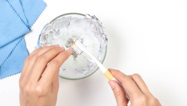 Quindi, prendete il bracciale e sfregatelo bene con lo spazzolino da denti, facendolo scorrere sul palmo della mano. Passate bene lo spazzolino su tutto il braccialetto e sfregate un po’ di più sulla chiusura. Poi, svuotate la ciotola dall’acqua insaponata, sciacquatela bene e riempitela solo con acqua pulita.