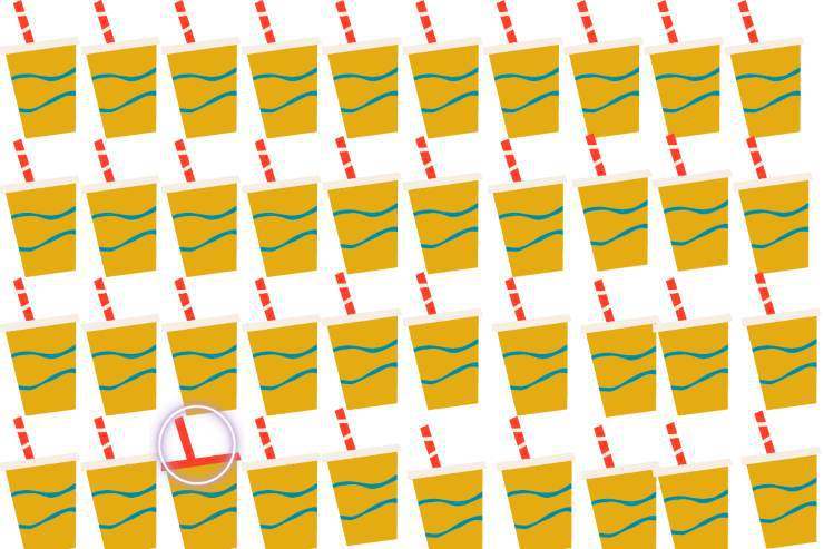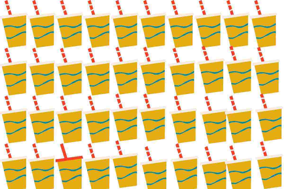 Se avessi osservato con attenzione l’immagine, avresti facilmente individuato l’intruso tra tutti i bicchieri. Nell’ultima fila, a partire da sinistra, il terzo bicchiere è leggermente diverso dagli altri. Certo, come dicevamo poco fa, non parliamo di grosse differenze sostanziali, questo è vero. Se avessi avuto, però, un attento spirito d’osservazione, avresti rintracciato facilmente la cannuccia completamente rossa, a differenza delle altre bianche e rosse, e il coperchio completamente rosso.