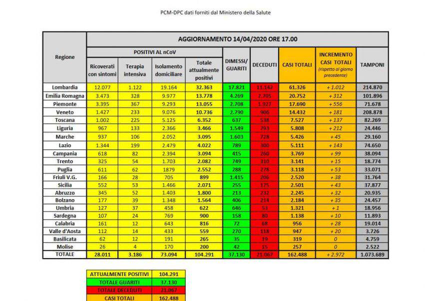 Casi di Covid-19 in Italia aggiornati a martedì 14 aprile 2020