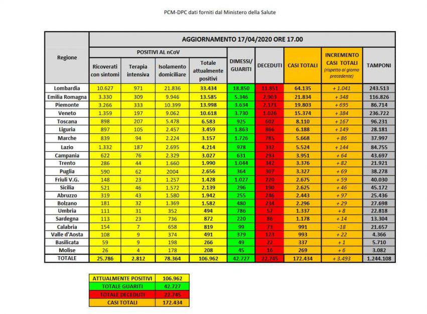 Casi di Covid-19 in Italia aggiornati a venerdì 17 aprile 2020