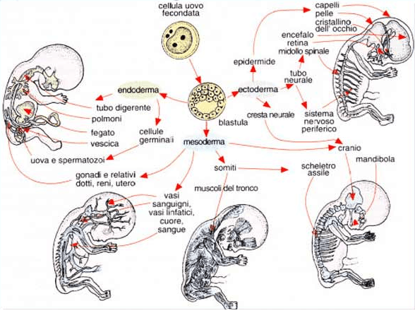 - mesoderma, definito anche strato intermedio, dal quale si formeranno gli organi genitali, le ossa, i reni, i vasi sanguigni e i muscoli,